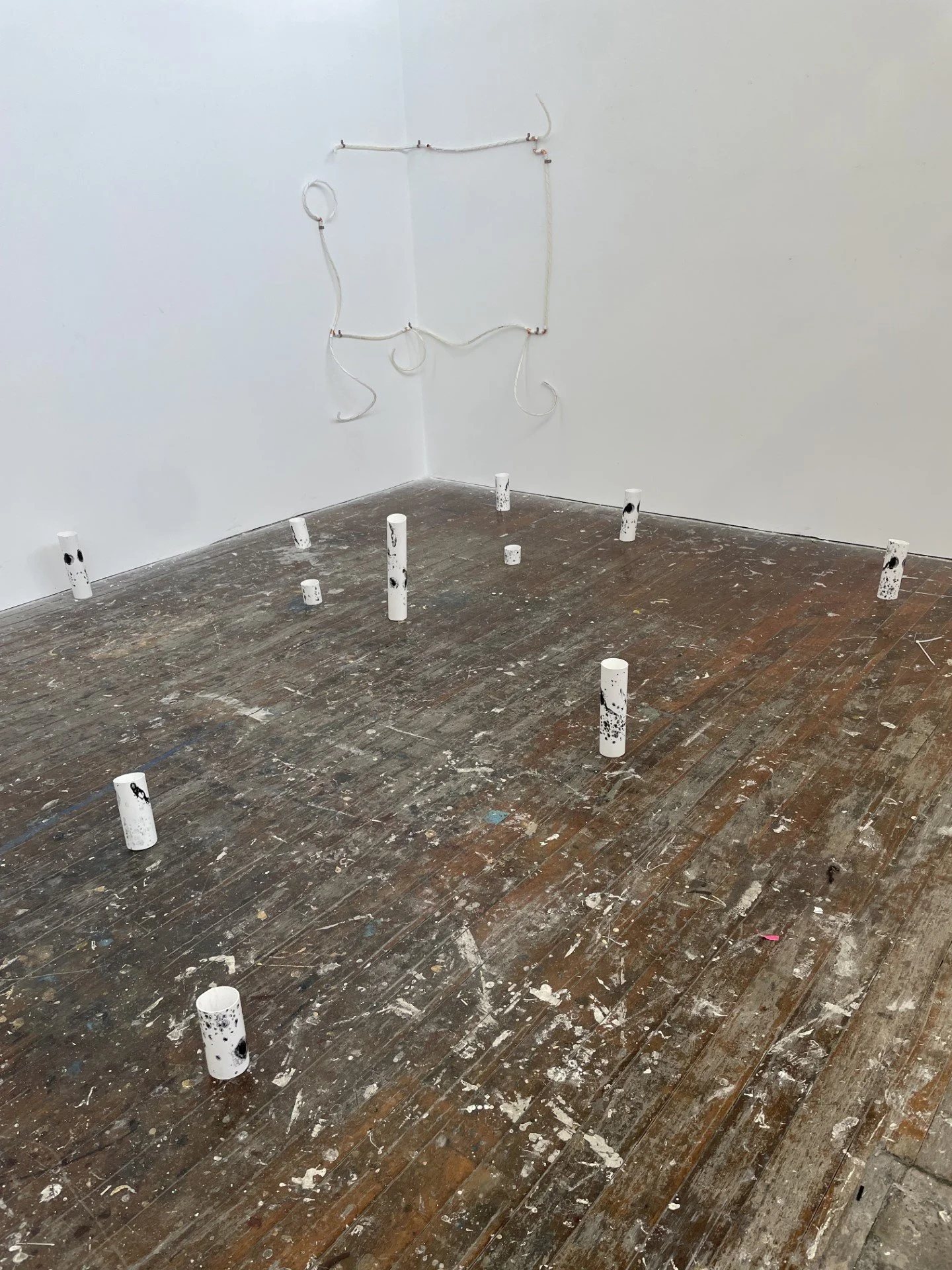 I went to bunnings and purchased some copper joints (reflecting their use in roman civilisation), and 7 metres of clear pipe to construct my map out of. I initially planned to hang up the ink marks I had collected within the centre of the map, but Dane recommended to keep this space clear as it was still and active area. He also suggested I printed on some PVC piping, so I went to the workshop and sawed them into small pieces. At this stage I was in two minds whether to hang them up on the wall or to have them arranged on the floor. After cutting them up I went to the printing tech and asked for some help, and he showed me how I could load up a screen with ink, flip it over and roll the pipe on it to transfer a print. I used the same Rosarsch test image that I had exposed earlier on the pipes to communicate human need to trap water through an illustration of vapour. Both Dane and Alex suggested that I lay out the pipes on the ground taking up a large space. I did this and found it to be really effective, however when I was recieving feedback it seemed that the two works were better separately and together there seemed to be too much happening visually. From this point I am focussing on the floor work of the pipes, and plan to continue this printing on PVC, playing with colour and transperancy, but also I want to have a projection exploring the movement of vapour more clearly, and I want to do this through animation, bringing my initial drawing to life. I have never animated before so I have lots to learn, but I will do it on Adobe Animate and learn as go via youtube.