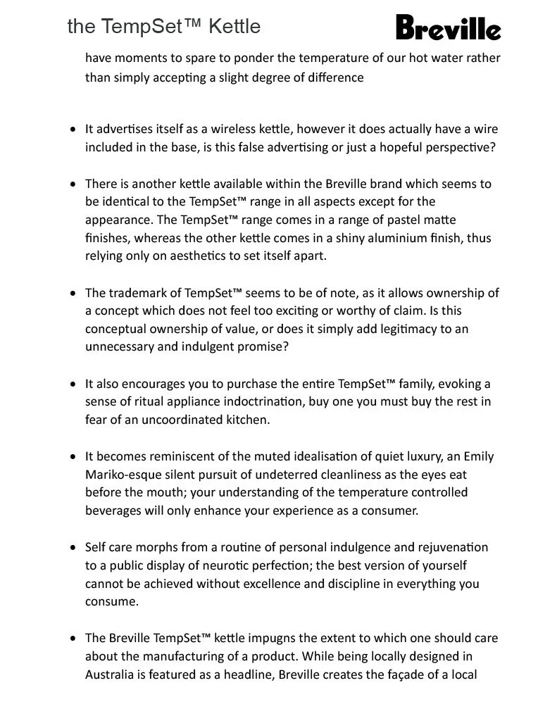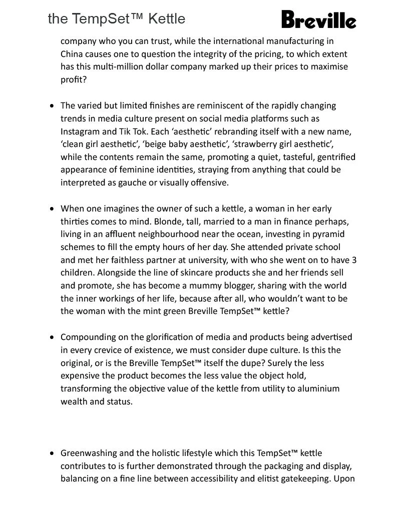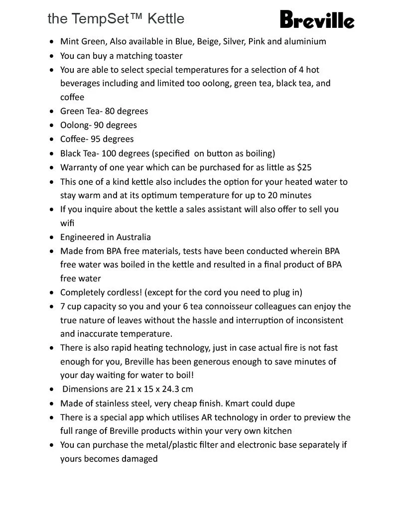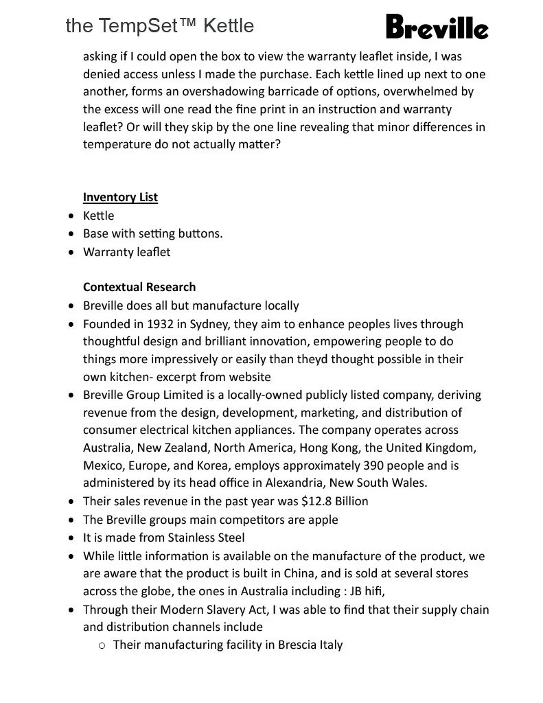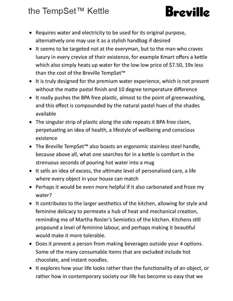 After reading Junkspace, we entered the late capitalist mall to explore the context of an overwhelming store from an altered perspective. I chose JB-HIFI and selected a Breville Tempset Kettle as my chosen gadget. We then embarked on our research and sketches beginning our diagramatic drawings as follows…